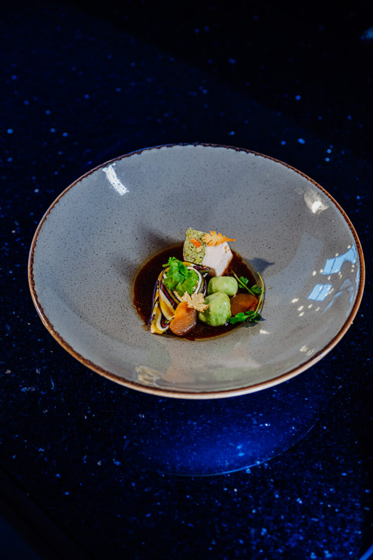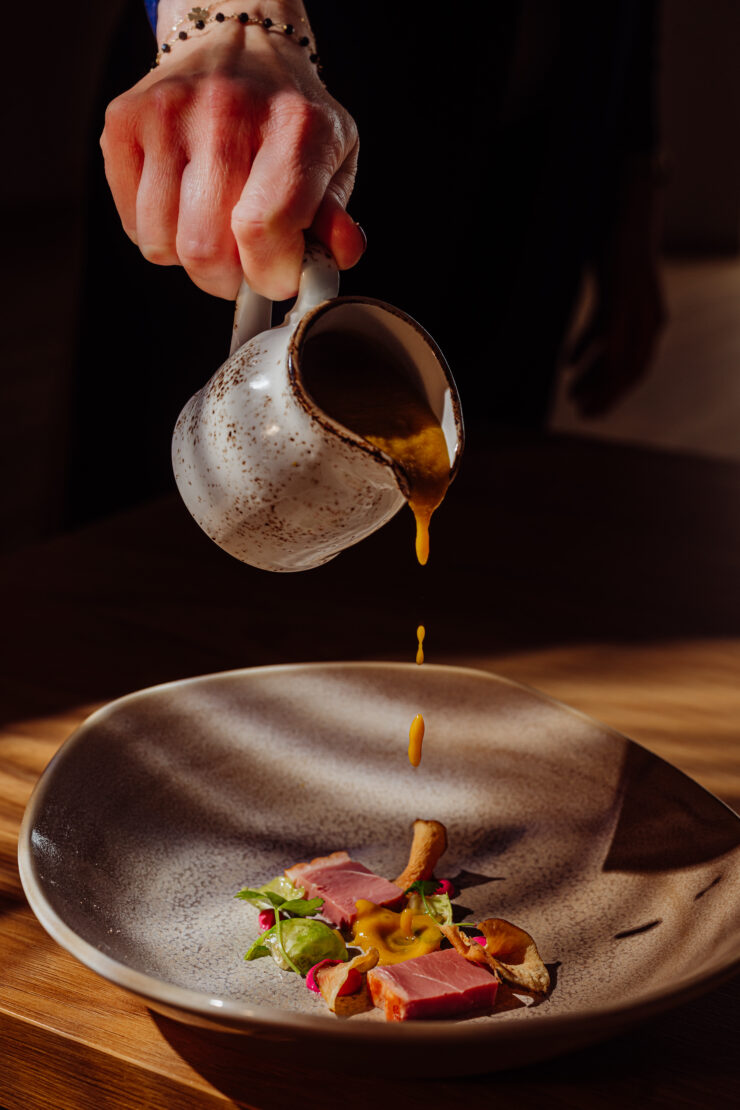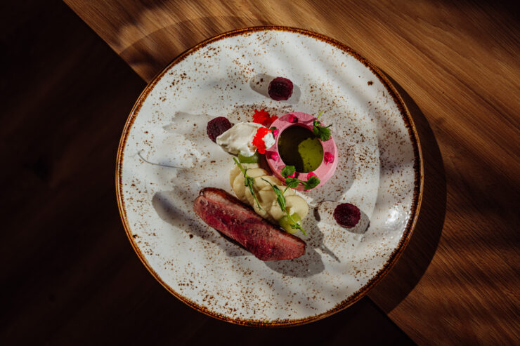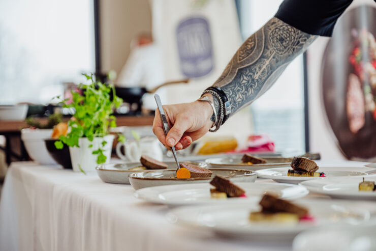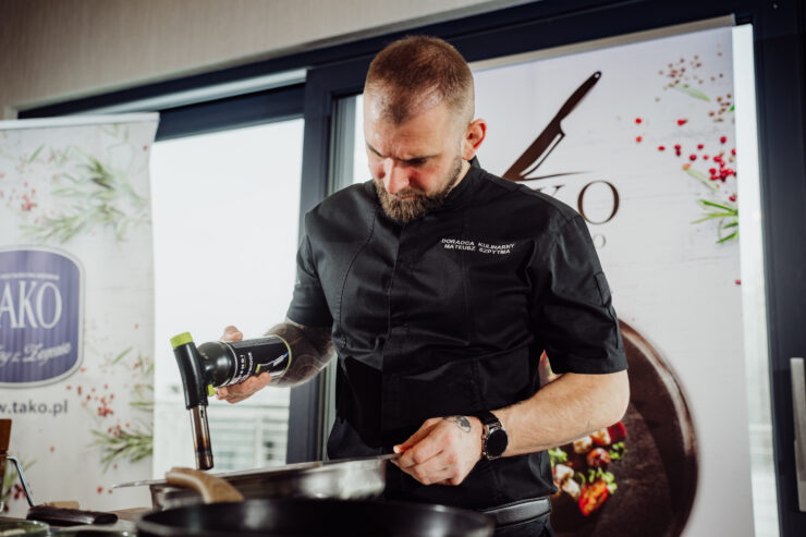 Biały puch okrył naszą kuchnię, kiedy w jej wnętrzach rozgrzewały nas autorskie dania Mateusz Szpytma. Mieliśmy przyjemność częstować się aromatycznym kremem marchiowo-imbirowym z Piersią z kaczki wędzonej TAKO, za to dania główne – to było czyste szaleństwo smaków! Zaserwowano nam pierożki twarogowe z kaczką z redukowanym fondem cielęcym, następnie pierś kurczaka nadziewaną puszystym farszem drobiowym, do tego kluski szpinakowe, crème fraîche oraz kolendra. Szczególnie zachwyciły nas comber z sarny z gratiną ziemniaczaną i pianą grzybową oraz prosty, ale zawsze tak samo pyszny, schab z kością w panko i puree ziemniaczane.